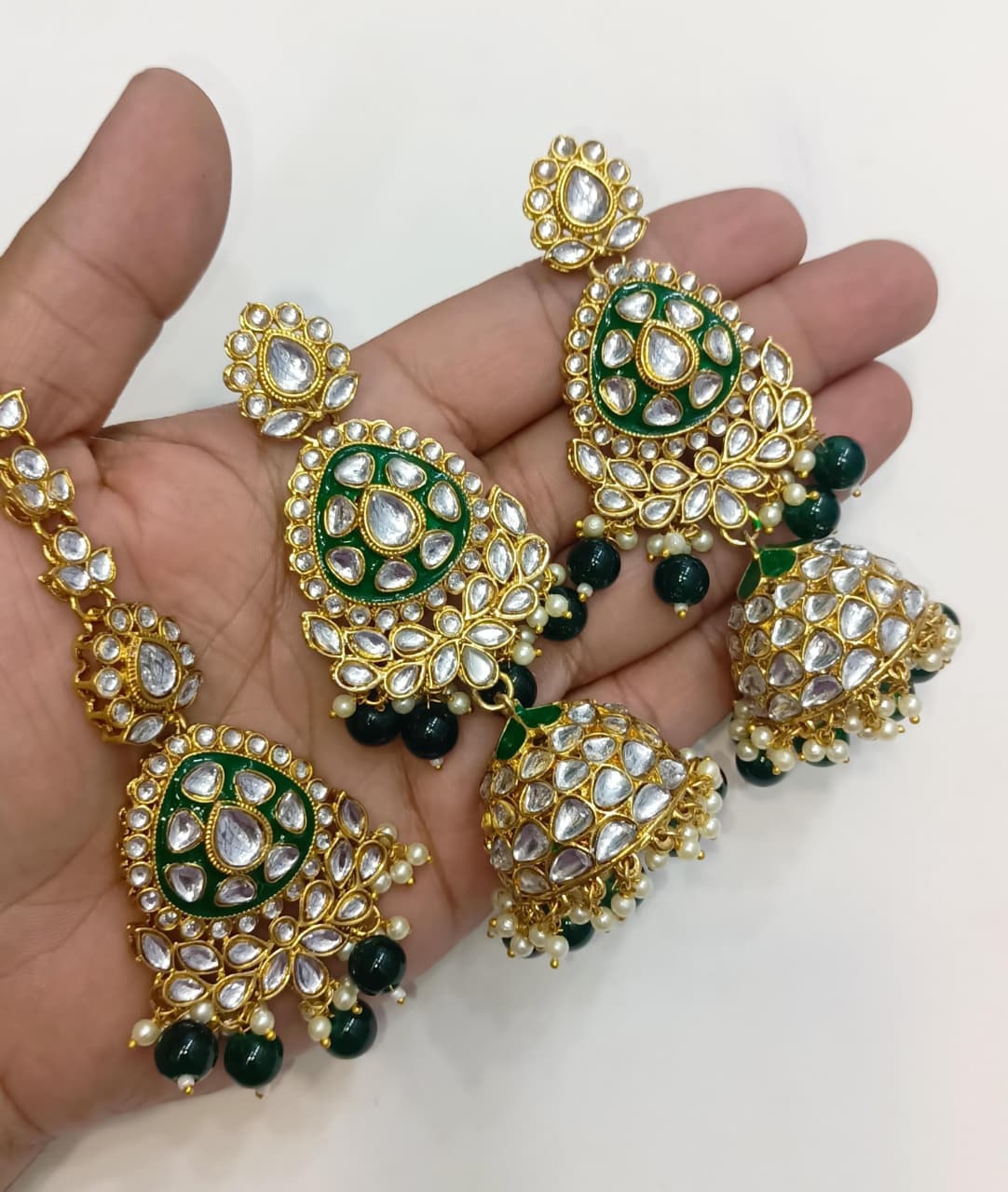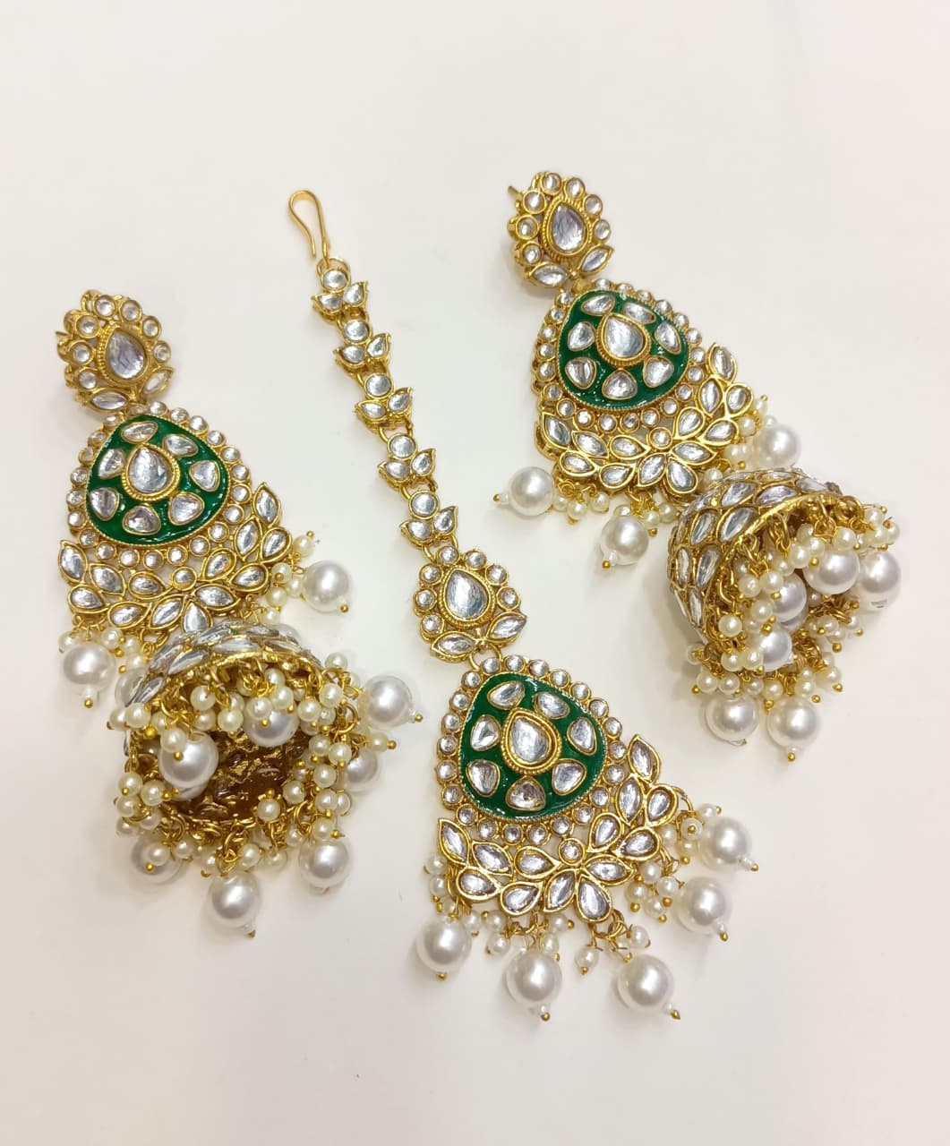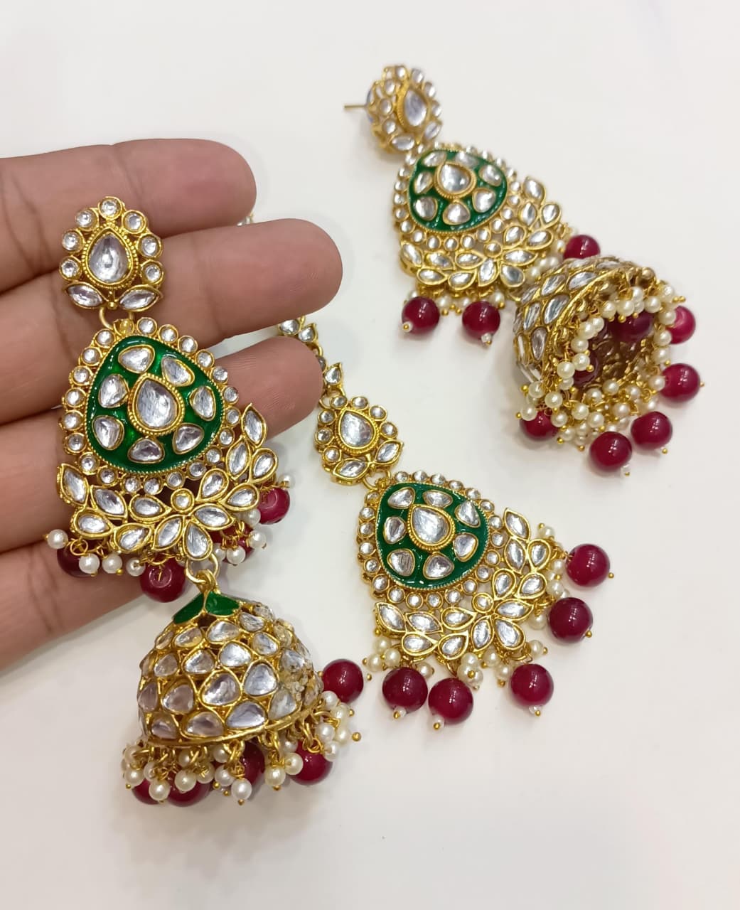 Elegant Indian jhumki earrings adorned with kundan stones, paired with a matching teeka. These traditional pieces feature intricate craftsmanship and a generous size that makes a striking statement. Perfect for weddings, festivals, and special occasions.