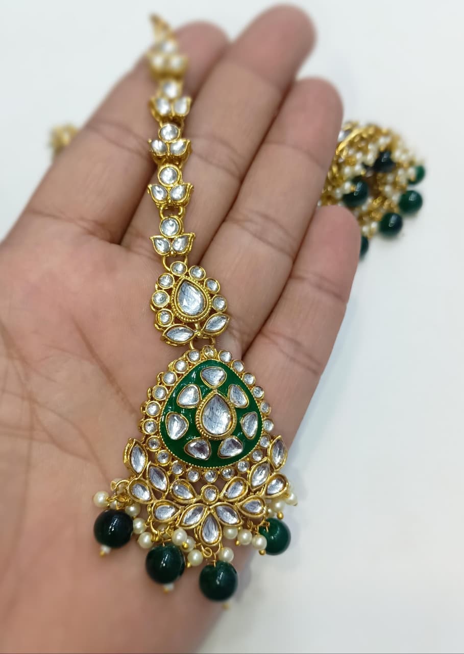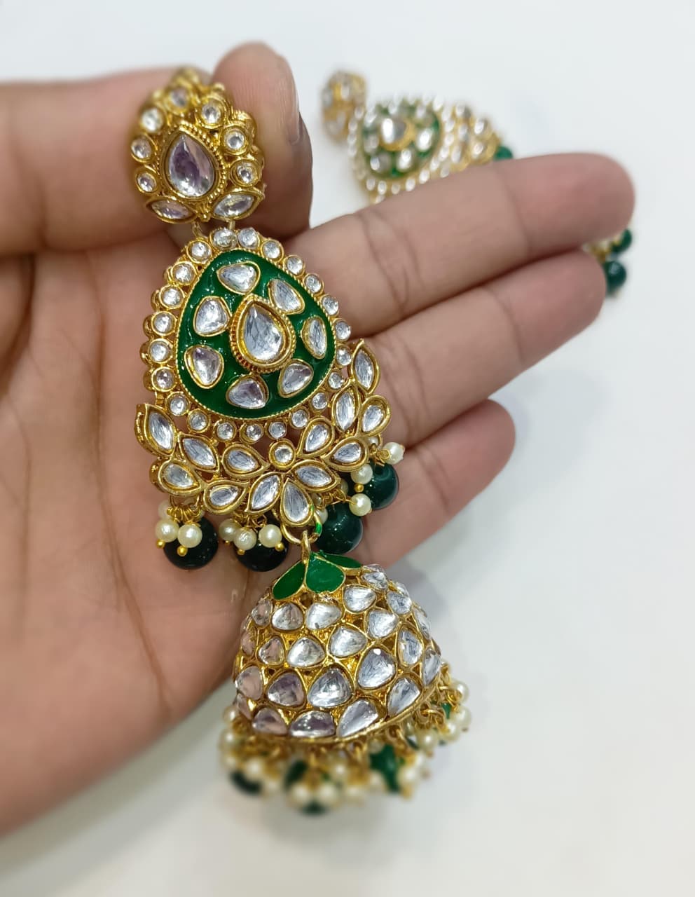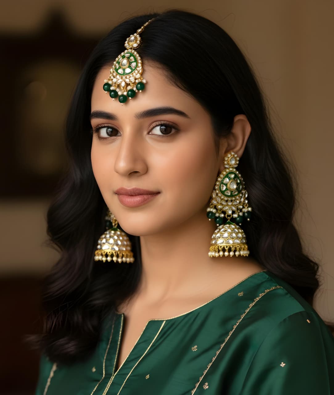 Elegant Indian jhumki earrings adorned with kundan stones, paired with a matching teeka. These traditional pieces feature intricate craftsmanship and a generous size that makes a striking statement. Perfect for weddings, festivals, and special occasions.