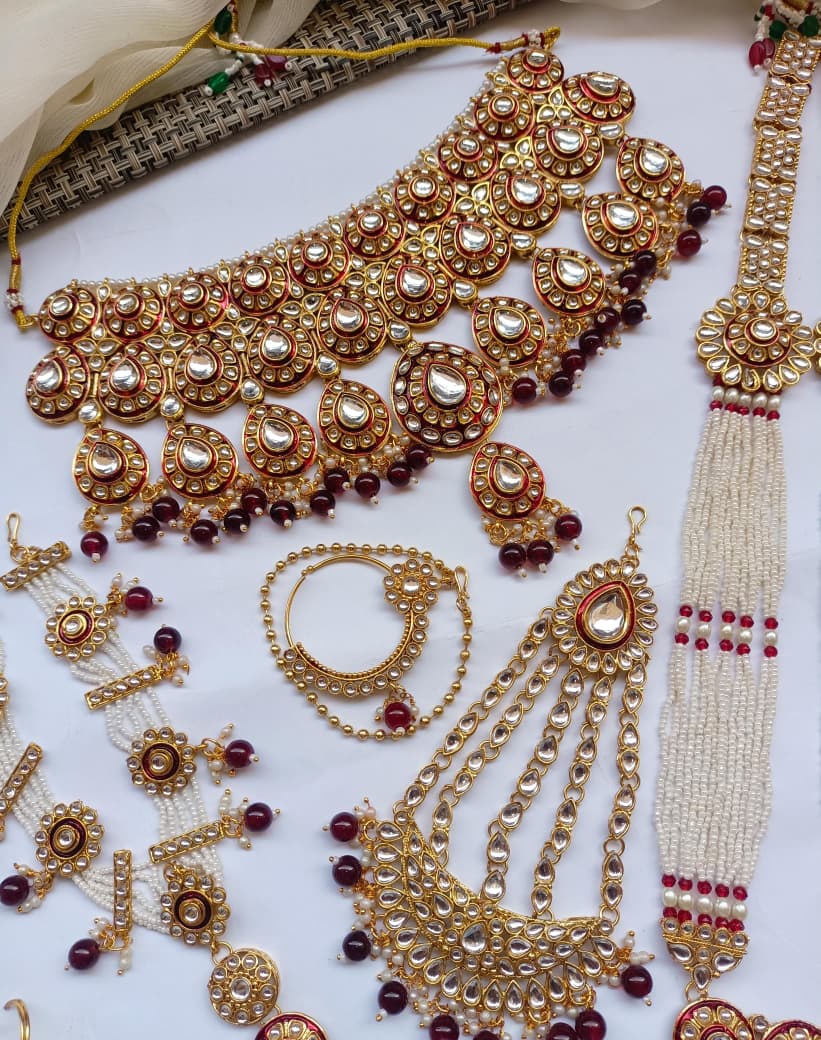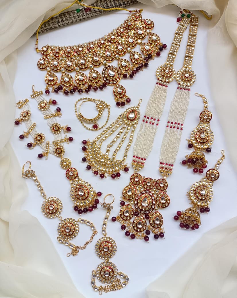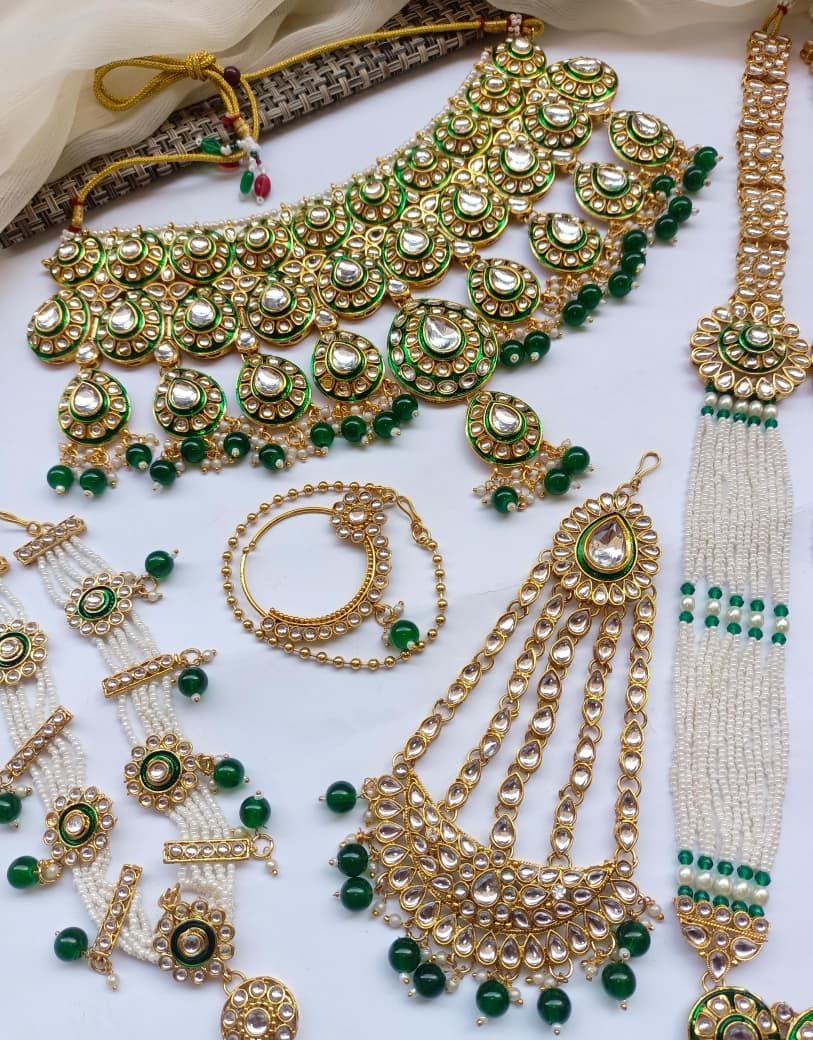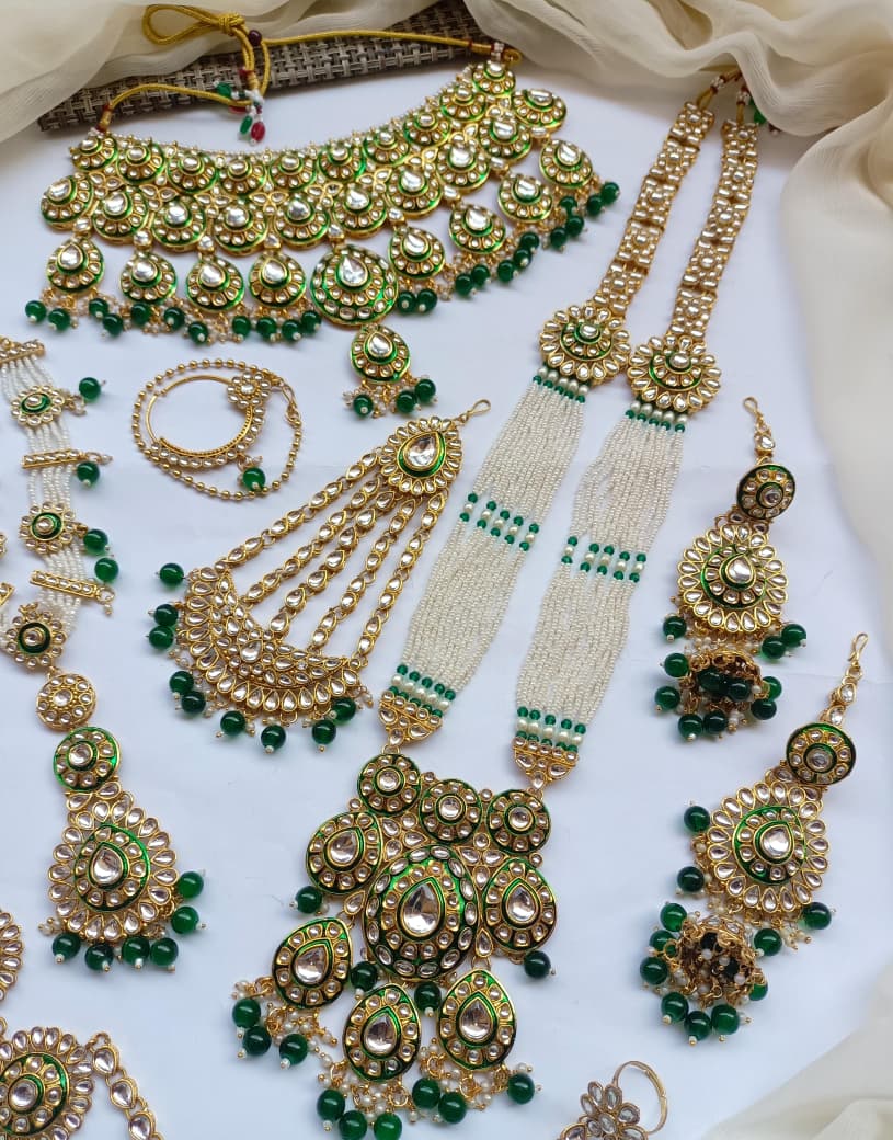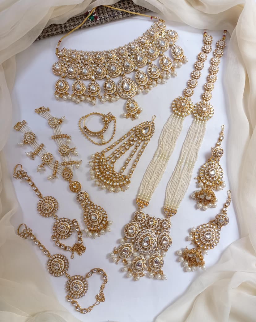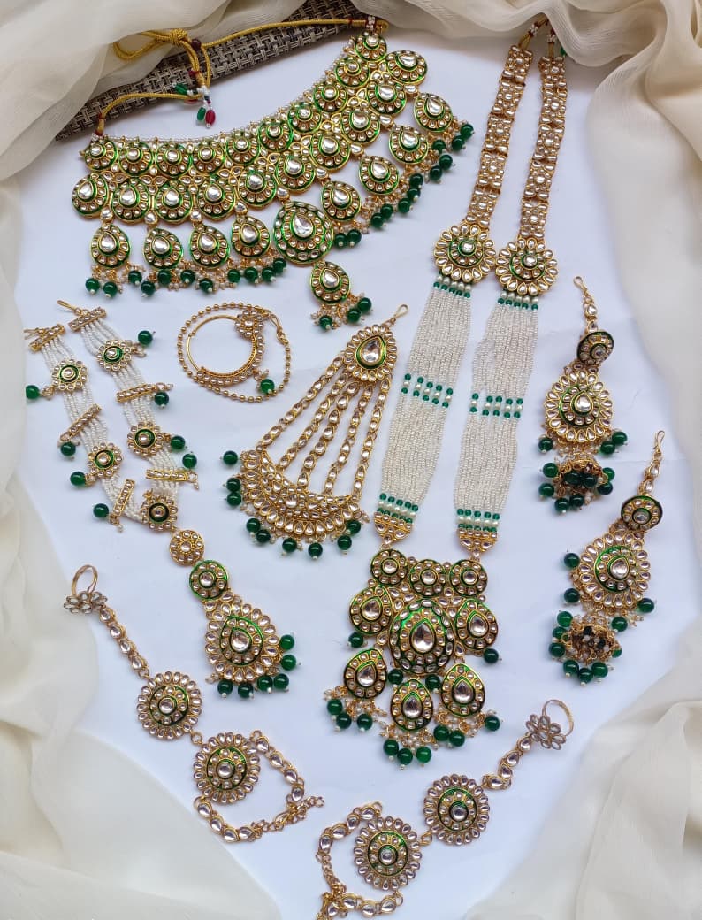 Designer Collection Indian Dubbi Kundan Stylish Complete Bridal Dholna Package represents the pinnacle of traditional bridal craftsmanship. This exquisite ensemble combines authentic kundan work with contemporary styling, featuring intricately detailed pieces that showcase masterful gemstone setting and traditional metalwork. Each component is thoughtfully curated to create a cohesive bridal look, from ornamental accessories to statement pieces that capture the essence of Indian wedding aesthetics. The collection emphasizes quality materials and precision craftsmanship, ensuring durability alongside visual splendor. Perfect for brides seeking an authentic yet refined approach to traditional bridal adornment, this package delivers comprehensive styling solutions for your most significant celebrations.