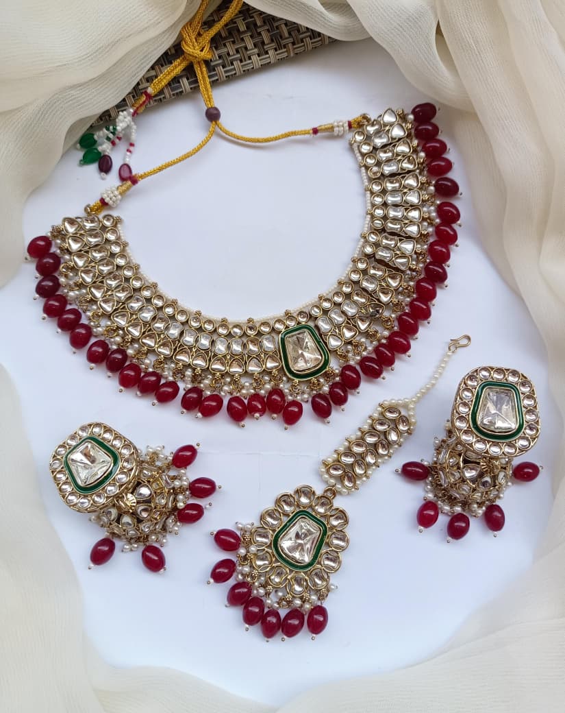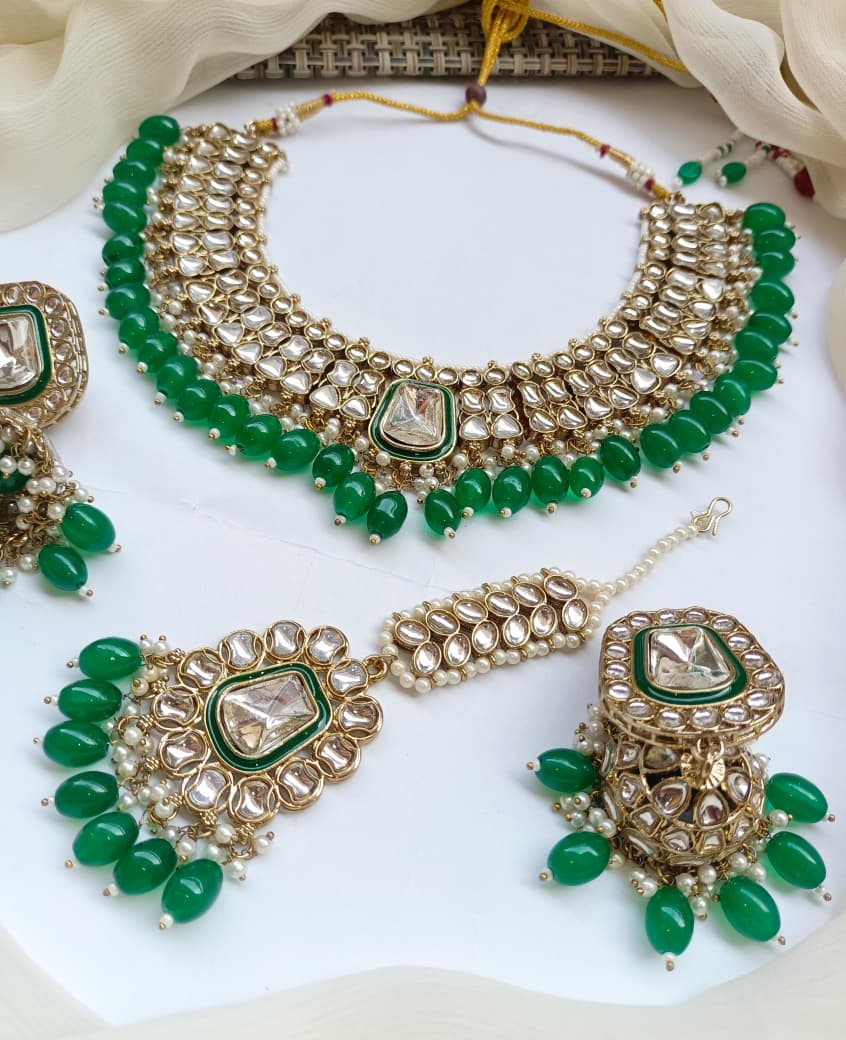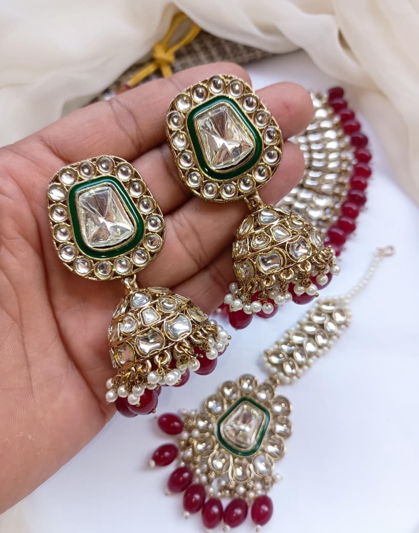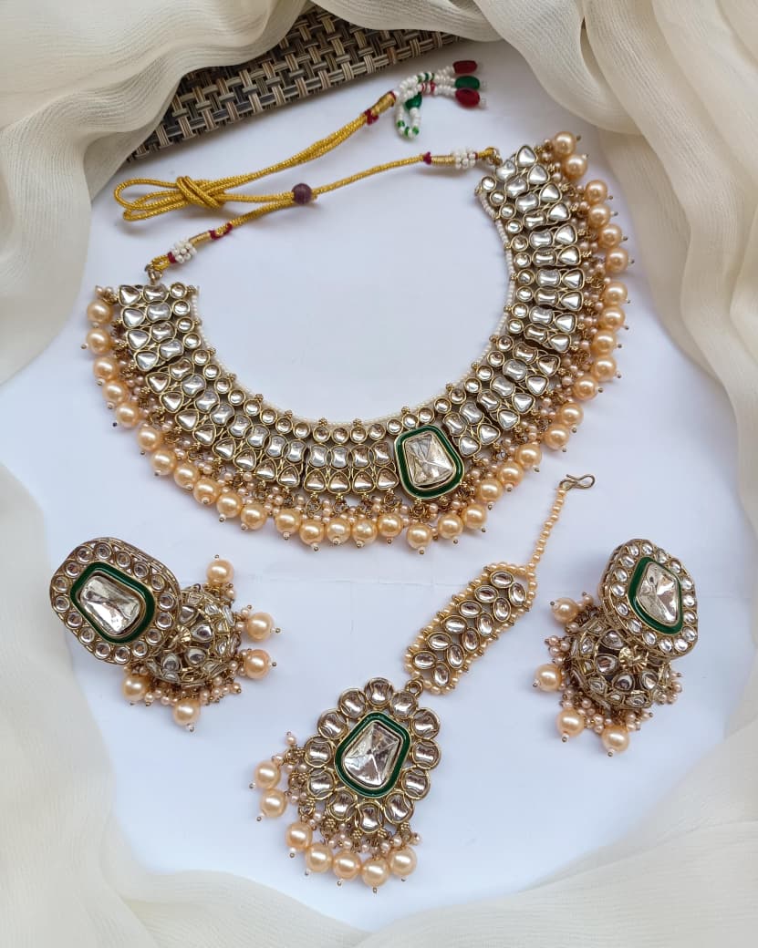 Elevate your traditional jewelry collection with this exquisite Necklace Set featuring authentic Indian craftsmanship. The ensemble showcases intricately designed Jhumkis adorned with lustrous Kundan work, complemented by an antique polish finish that exudes timeless elegance. Each piece reflects meticulous attention to detail, combining the ornamental Dubbi technique with classic Indian aesthetics. The coordinating Teeka adds a refined finishing touch, completing your ceremonial or festive look with sophistication. Crafted to enhance both bridal and everyday ethnic wear, this set represents the perfect marriage of traditional artistry and contemporary style. An investment in heritage jewelry that transcends seasonal trends.