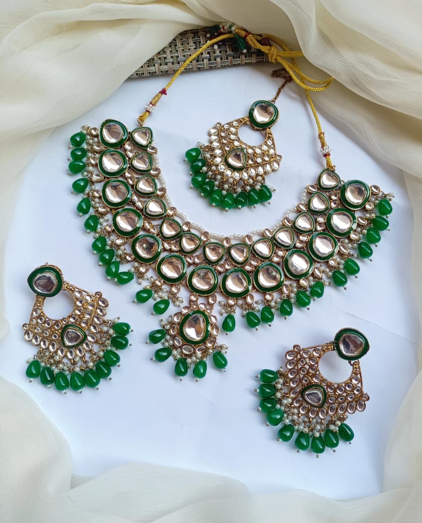 Elevate your traditional jewelry collection with this exquisite Designer Collection Dubbi Kundan Meenawork Necklace Set, complete with a matching teeka. Meticulously crafted by skilled artisans, this set showcases the timeless elegance of kundan stone setting combined with intricate meenawork detailing. The necklace features precisely placed gemstones in a traditional dubbi design, while the coordinating teeka adds the perfect finishing touch to your bridal or festive ensemble. Each piece demonstrates exceptional craftsmanship and attention to detail, making it an investment in authentic, heirloom-quality jewelry. Ideal for weddings, celebrations, and special occasions where refined sophistication matters.
