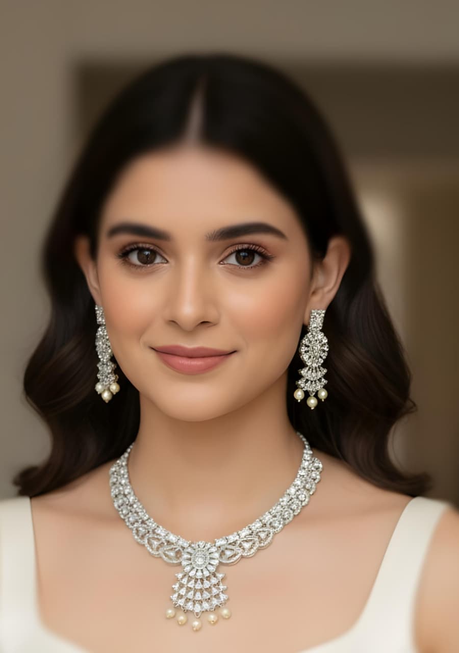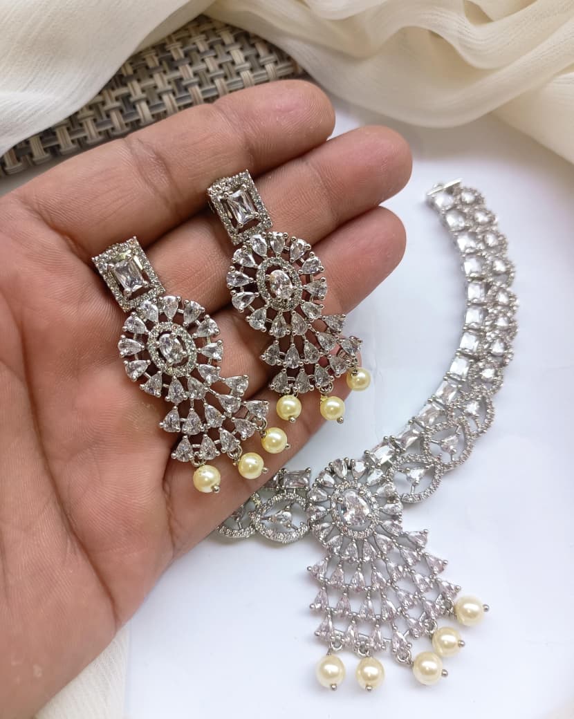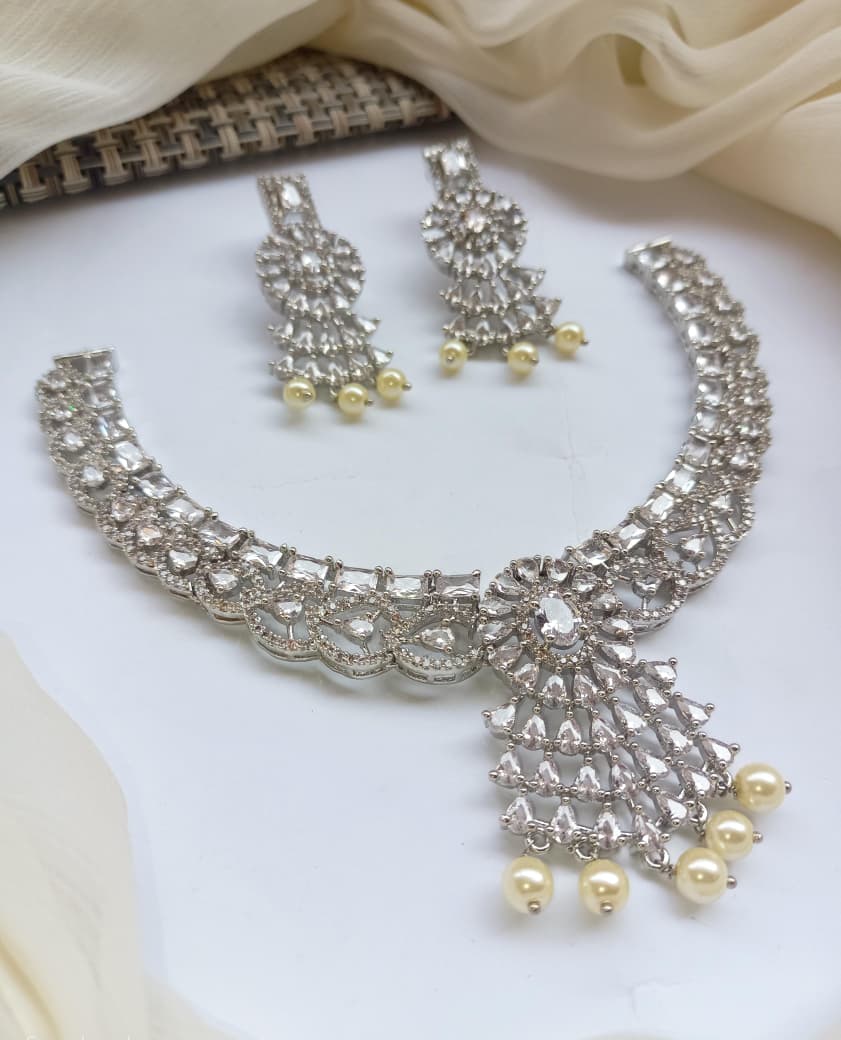 Elevate your evening ensemble with this exquisite PartyWear Necklace Set, crafted from premium-quality American diamond and zarcon stones. Each piece is meticulously designed to capture light brilliantly, creating a sophisticated sparkle that complements formal occasions and celebrations. The American diamond setting ensures durability and lasting radiance, while the zarcon accents add depth and dimension to the overall design. This versatile set pairs seamlessly with traditional and contemporary attire, making it an essential addition to any jewelry collection. Perfect for weddings, parties, and special events, this necklace set delivers timeless elegance with modern craftsmanship.