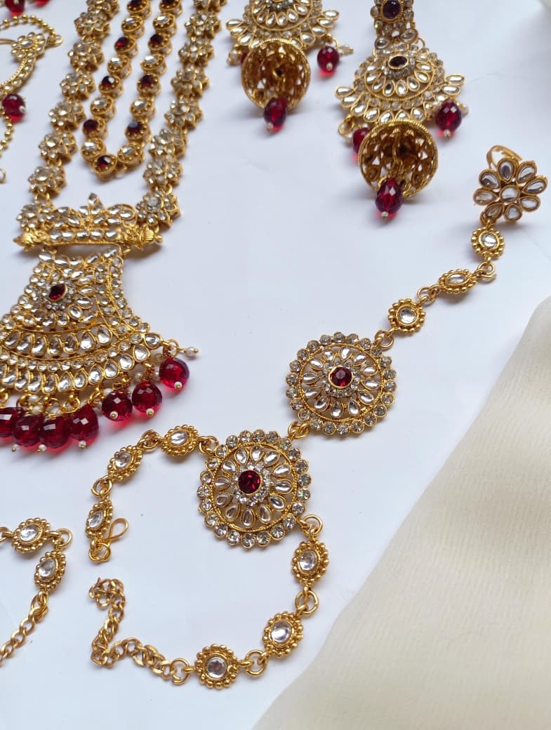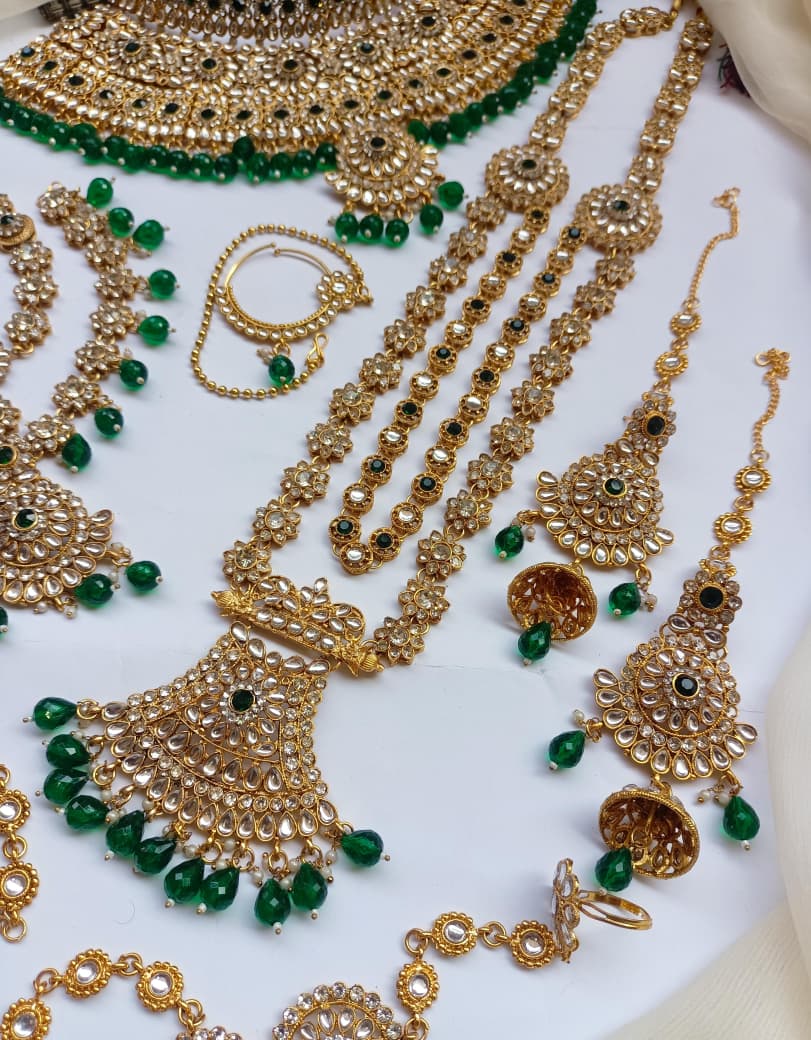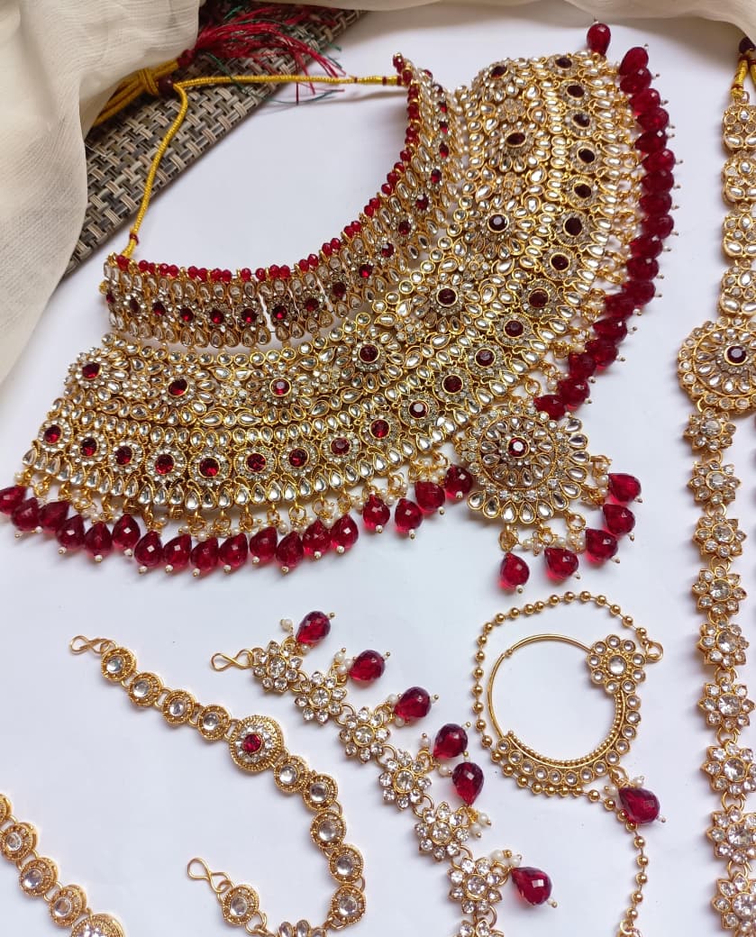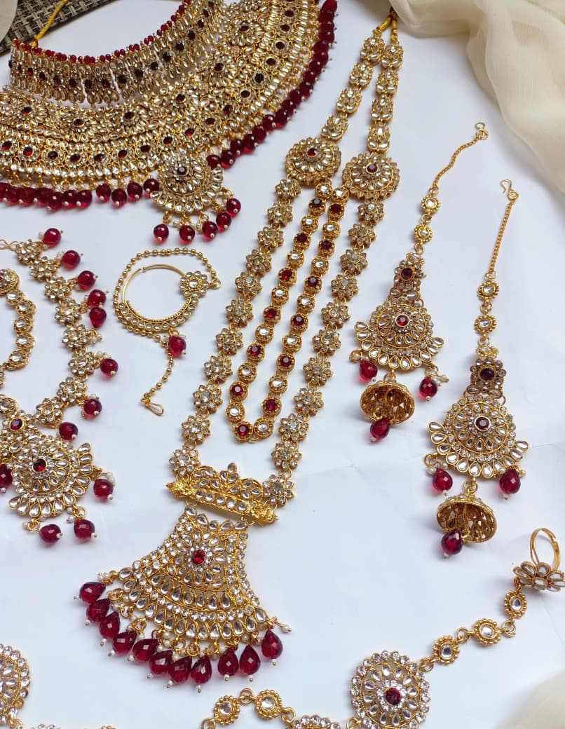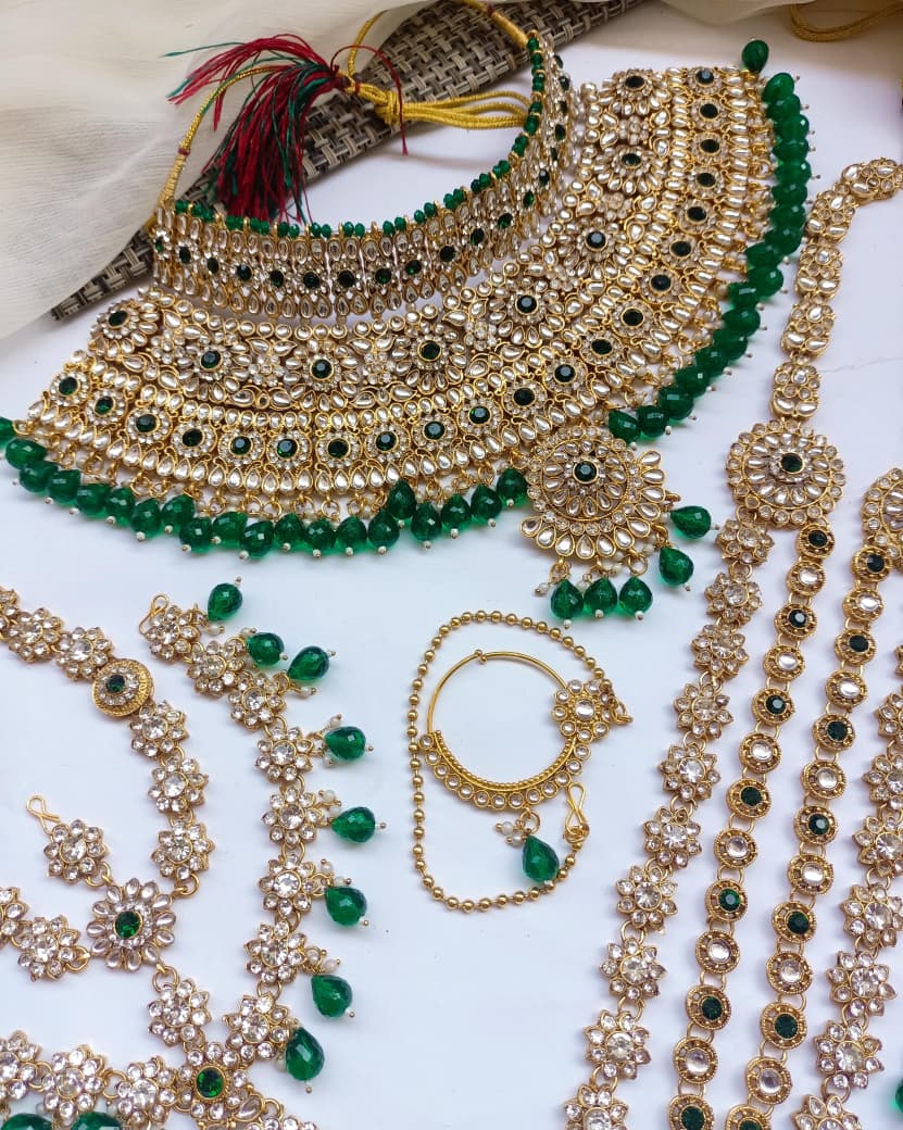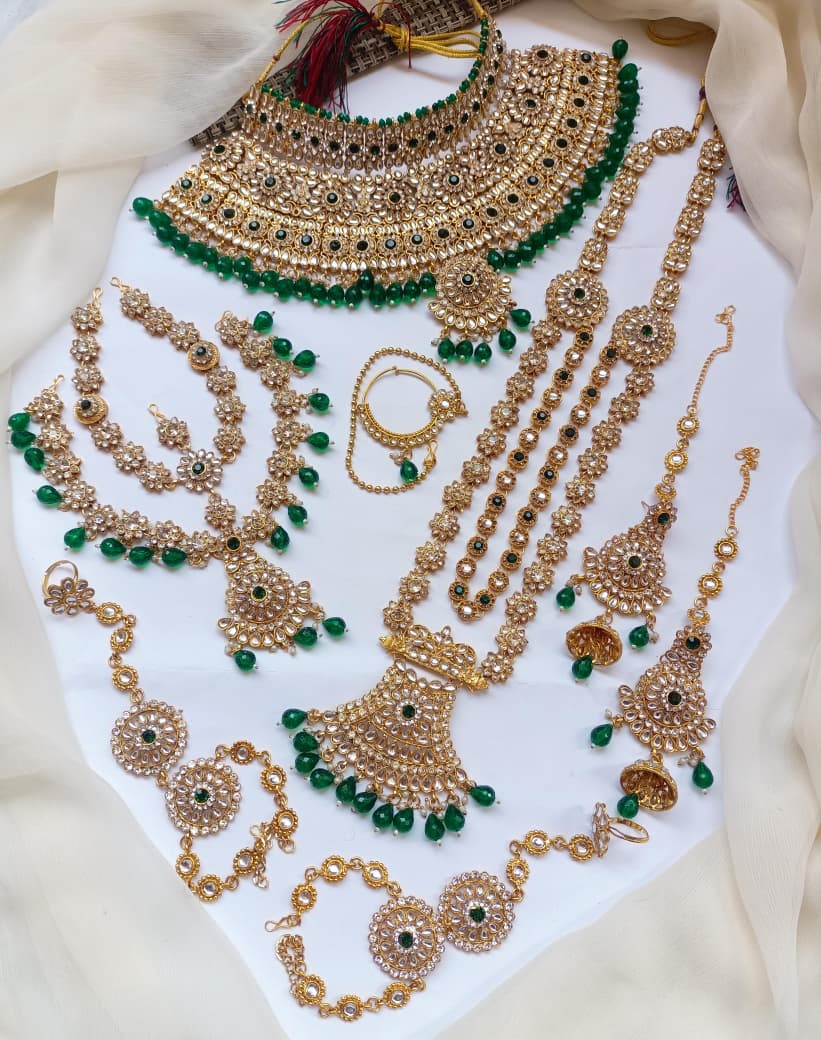 Elegant bridal dholna featuring intricate kundan embellishments and traditional Indian design. This complete package offers everything needed for a stunning wedding day look, combining timeless craftsmanship with sophisticated style.