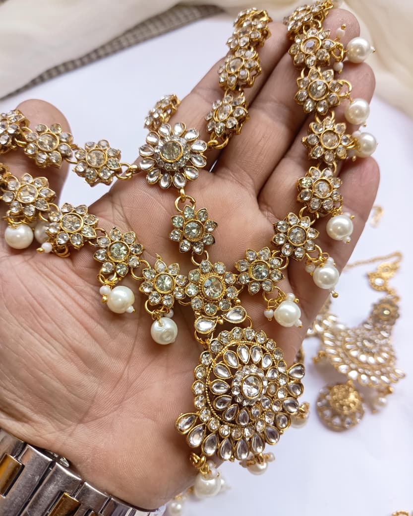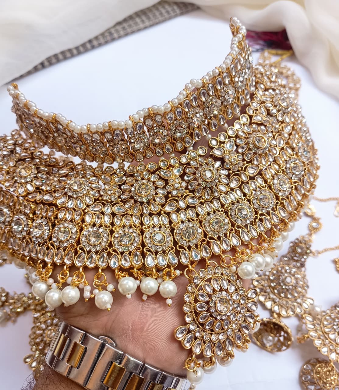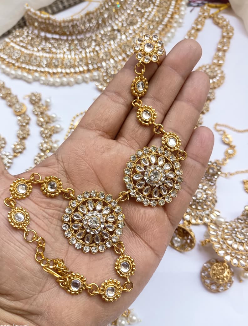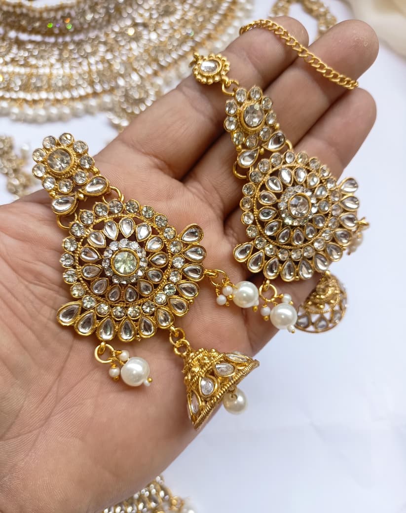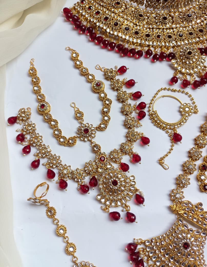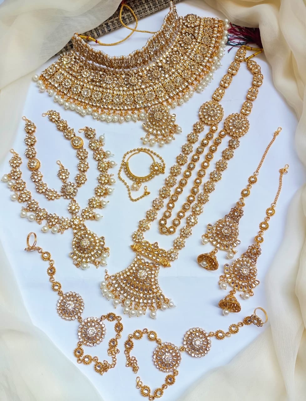 Elegant bridal dholna featuring intricate kundan embellishments and traditional Indian design. This complete package offers everything needed for a stunning wedding day look, combining timeless craftsmanship with sophisticated style.