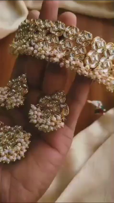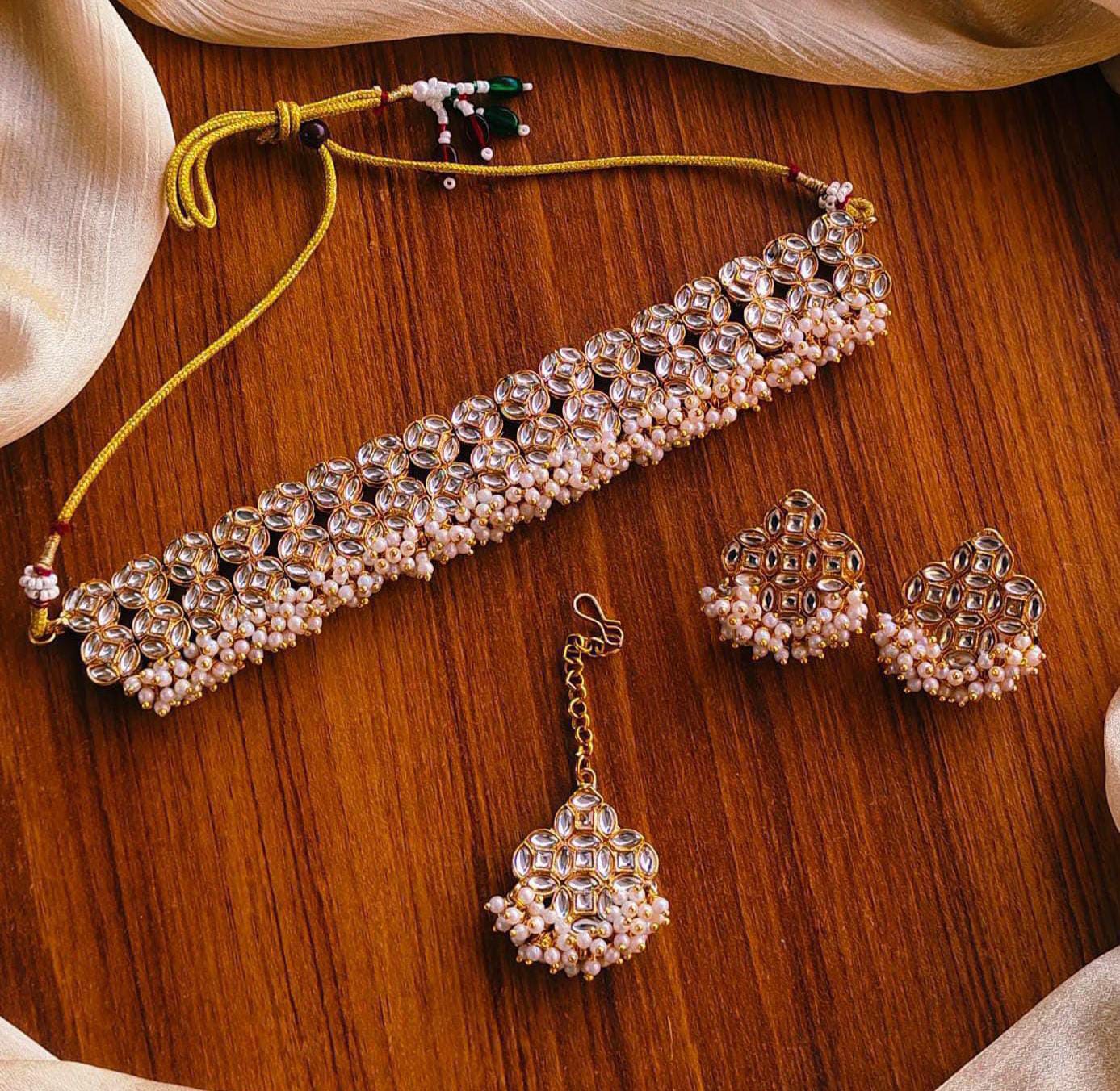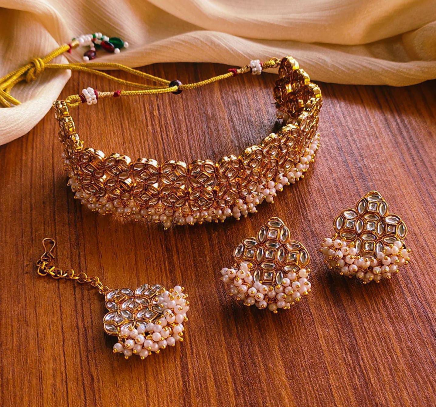Elegant Indian choker set featuring kundan embellishments, gajra design, and matching teeka. Perfect for traditional celebrations and special occasions.