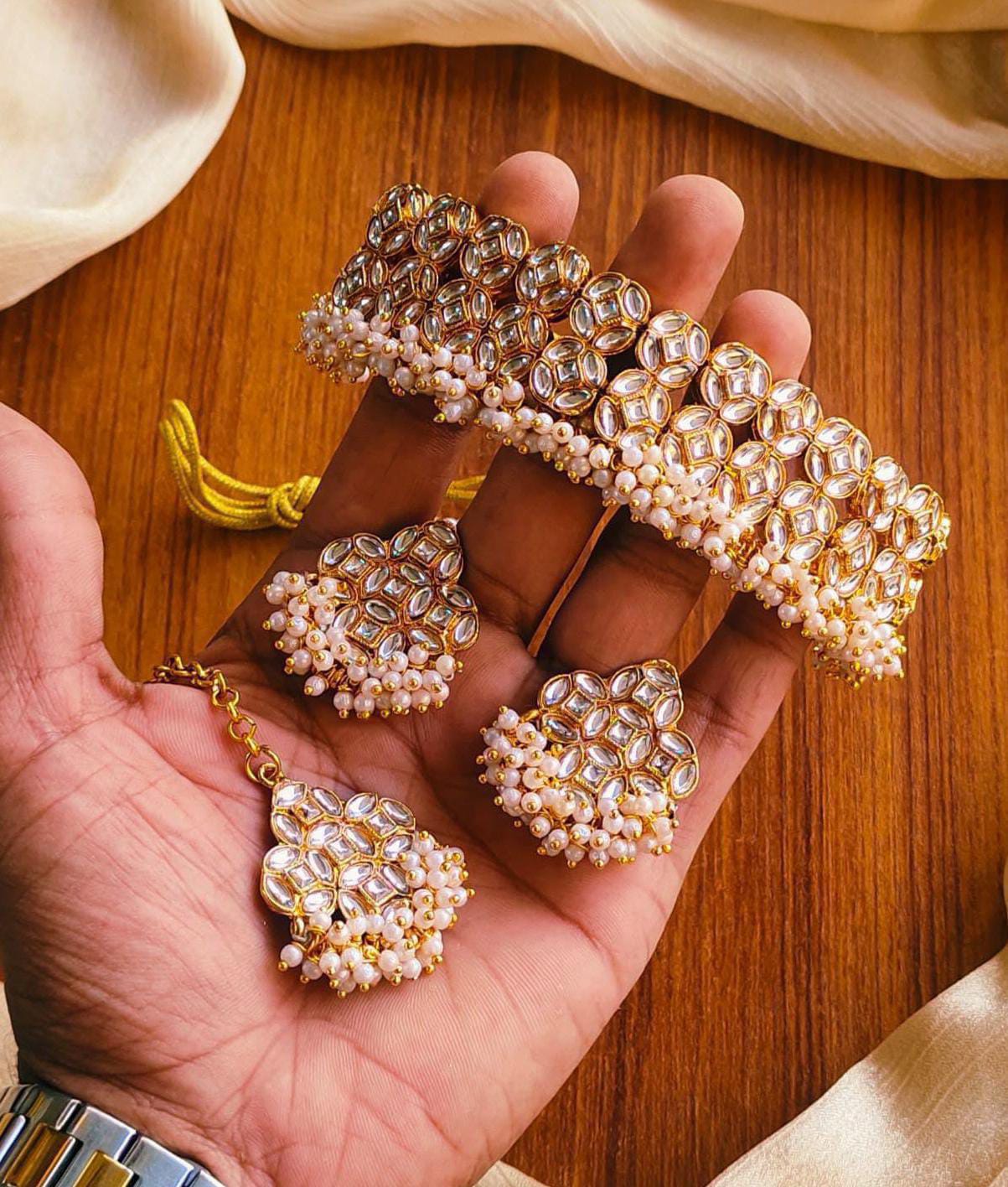 Stylish Design Indian Dubbi Kundan PartyWear Gajra Choker Set With Teeka
